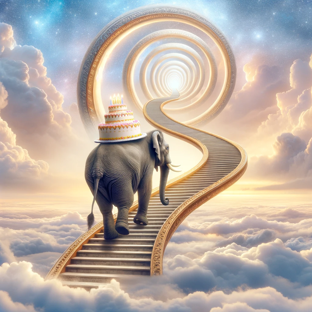 Can you make a picture of an elephant on an infinite spiral staircase in heaven, carrying a birthday cake on its back?